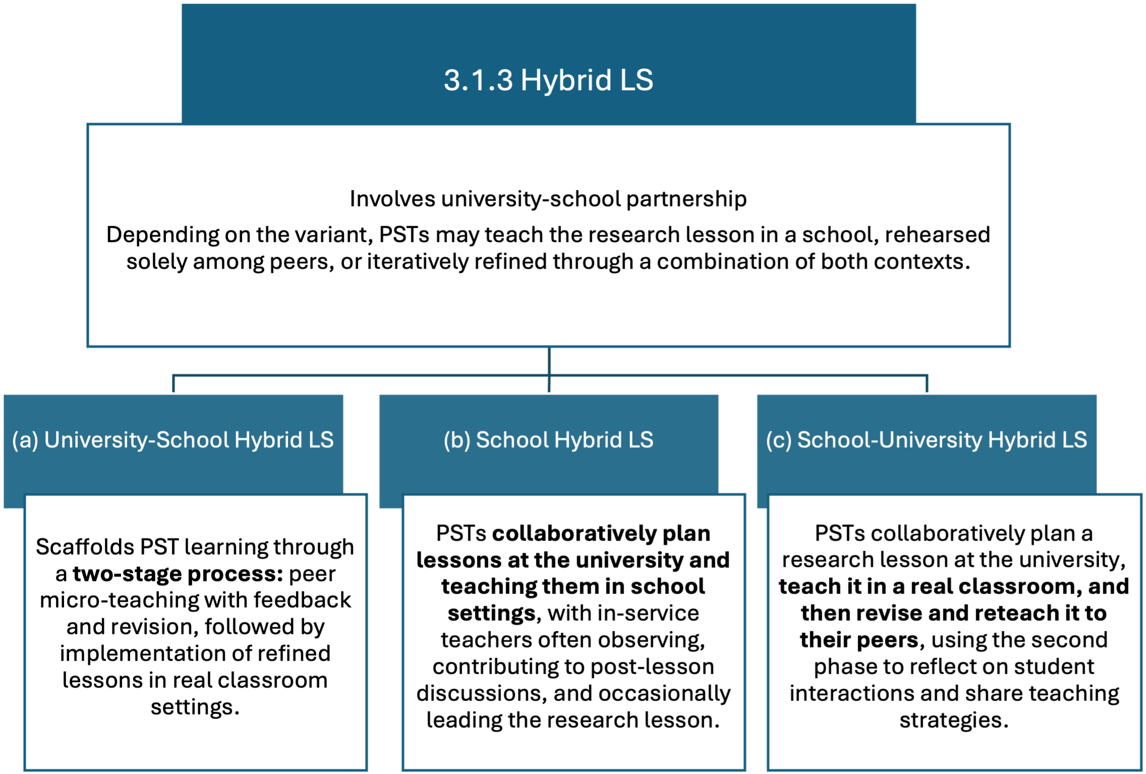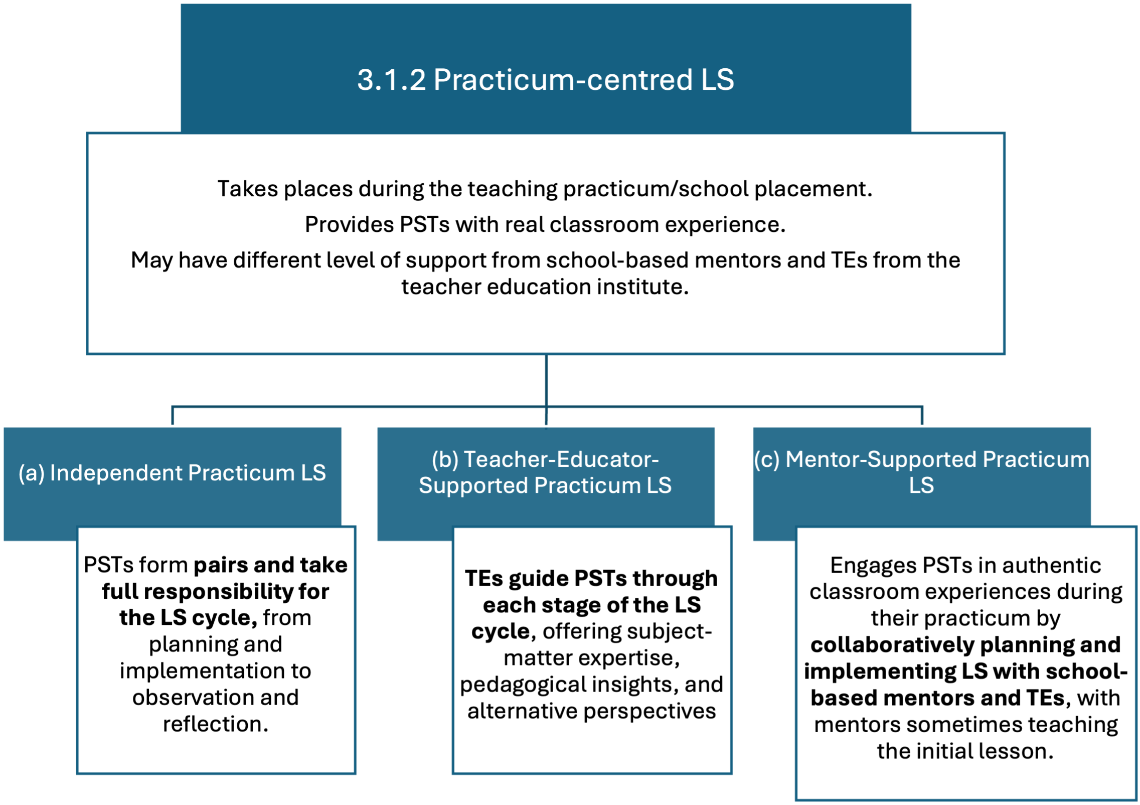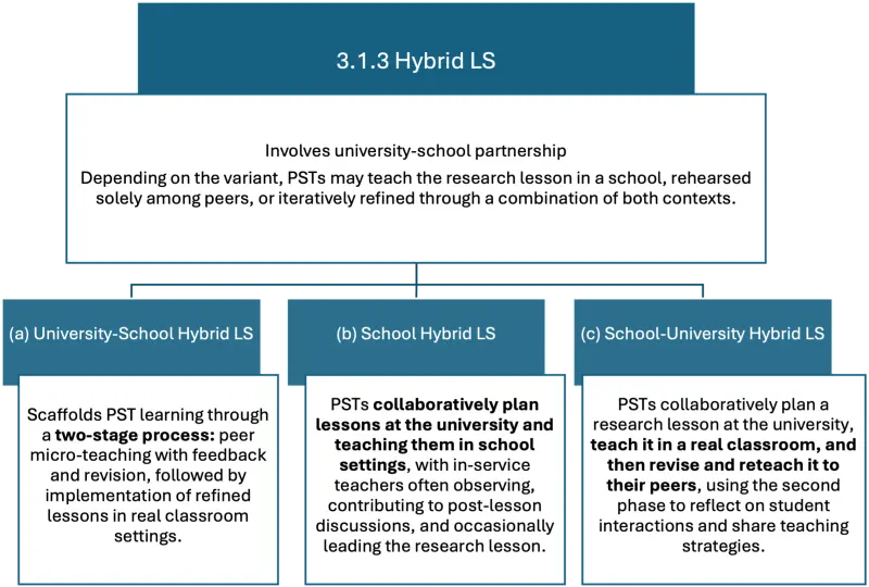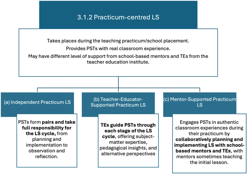 LS in ITE has the ultimate goal of improving student learning, by contributing to the LS group members’ professional development. With their participation in LS, PSTs, TEs and school-based mentors gain insight into the learning process of school students in order to improve one’s own actions as a teacher in practice so that students can learn better. LS also reinforces the inquiry stance and the collaborative culture usually existing in ITE. It is specifically targeted at developing PSTs’ expertise in their pedagogical content knowledge (or didactical knowledge) and educational knowledge. It also promotes the reflective and collaborative skills of the participants, among PSTs and between PSTs and TEs.