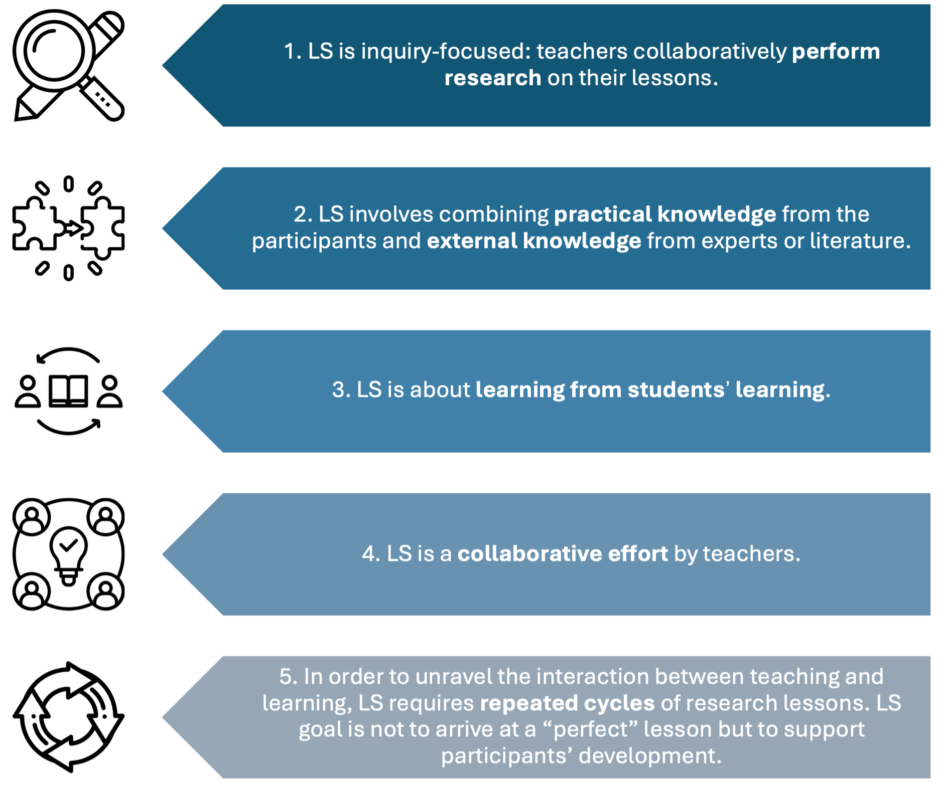 The LS process can be considered in a systemic way, as it creates a community of learning with different interrelated layers. The school students are learning during the research lesson, and they should know that the goal of the observation is to improve teaching and their learning so that they feel part of the community of learning.