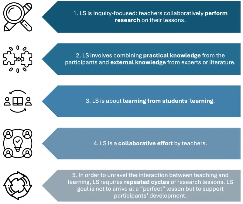 The preservice or in-service teachers participating in the LS acquire professional knowledge related to the effect of their teaching on students’ learning. Literature in this field shows that this learning may take various forms: better linking theory and practice, adopting a reflective and inquiry stance, developing collaborative skills, fostering teacher noticing, focusing on pupils and learning rather than on teaching, developing an attitude to anticipate pupils’ reasoning, deepening subject-matter knowledge and pedagogical content knowledge, as well as improving teaching skills such as precise language use and time management.